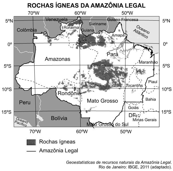 O mapa mostra a distribuição das rochas ígneas na Amazônia Legal. Esse tipo de rocha se forma a partir do resfriamento do magma e está diretamente ligado às regiões mais antigas e estáveis do relevo brasileiro, conhecidas como escudos cristalinos. No Brasil, essas áreas ocupam grande parte do território e são extremamente relevantes para a economia nacional, pois abrigam jazidas importantes de minerais metálicos. Esse é o caso da Amazônia Legal, em especial do estado do Pará, onde se encontram grandes reservas de minério de ferro, bauxita, manganês, cobre, ouro, níquel e outros minerais estratégicos. A relação entre escudos cristalinos, rochas ígneas e minerais metálicos é fundamental para entender esse potencial econômico. Os escudos cristalinos são compostos predominantemente por rochas ígneas e metamórficas antigas, que sofreram longos processos geológicos, como intemperismo e erosão, expondo e concentrando os minerais metálicos. Esses processos geológicos favorecem a formação de depósitos minerais, tornando áreas como Carajás (PA) um dos maiores polos mineradores do planeta. As demais alternativas não correspondem à realidade mostrada no mapa. As áreas assinaladas não indicam regiões de “abalos sísmicos periódicos”, pois o Brasil está localizado no interior da placa tectônica sul-americana, uma área geologicamente estável. Também não correspondem a “reservas de combustíveis fósseis”, que estão associadas principalmente às bacias sedimentares, nem a “aquíferos sedimentares profundos”, já que essas formações ocorrem em terrenos sedimentares, não ígneos. Por fim, não se tratam de “estruturas geológicas metamórficas” apenas, pois a legenda do mapa mostra explicitamente que são rochas ígneas.