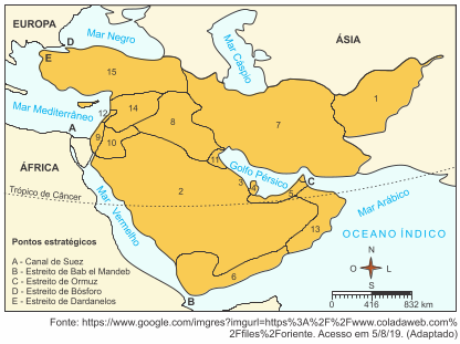 2. (Upf) O Oriente Médio constitui-se numa região estratégica do ponto de vista geopolítico por ser encontro da Ásia, da África e da Europa. Marcada pela instabilidade de limites políticos, e diversidade étnica e religiosa da população, a região é detentora de importantes reservas de petróleo.
