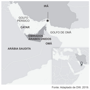 As tensões no Oriente Médio se dão em larga medida devido às disputas pelo controle de uma pequena área de extrema importância estratégica, a qual é rota de passagem entre o Golfo de Omã e o Oceano Índico e abrange águas territoriais do Irã, de Omã e dos Emirados Árabes Unidos. Essa área, circulada no mapa, é o